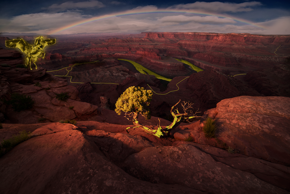 I found the Golden Skin Effect in Photoshop tutorial (by Nemanja Sekulic) and started colouring the river gold. Then the "yellow brick road" reference popped into my head and before I knew it I was also colouring the walking trails gold. With all that gold in the river, the tree must suffer from that right? So now bits of the tree had to become gold too. And "how would this be possible", you ask?... Golden Unicorn.