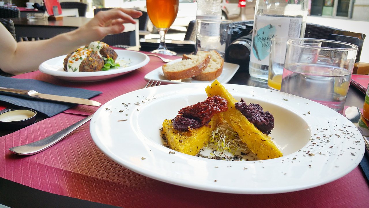 Oh that was a good dish! Mushroom croquettes, with some sort of bean humous. It was in an organic vegan restaurant/bar in Girona, Spain. By the end of our holiday I think we'd tried everything on their menu!