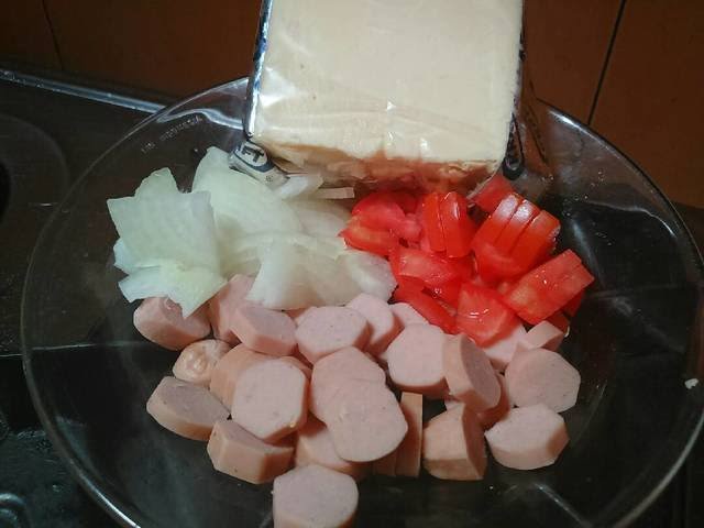 - Spread tomato sauce, put onions, fresh tomatoes, sausage and grated cheese