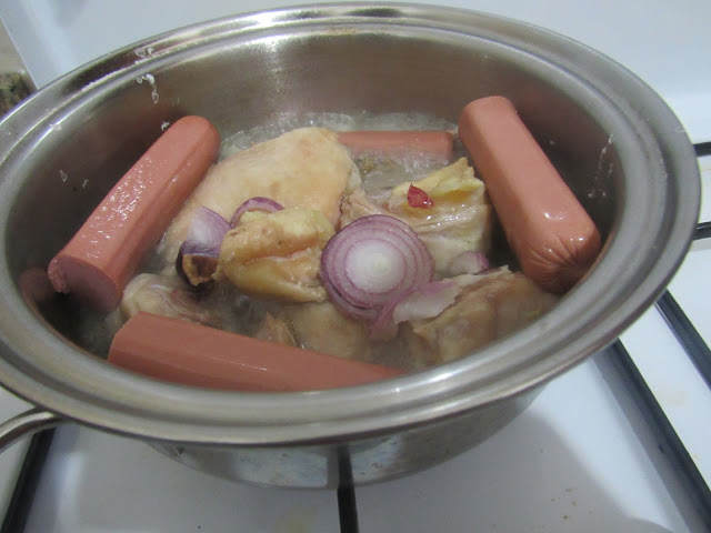 shred the chicken, sausages and vegetables. Your cabbage should be much more than onion.