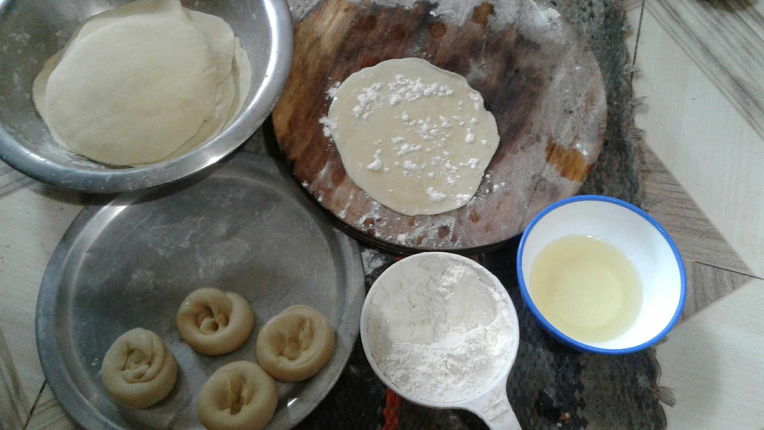 After this divide the dough into equal ball size pieces not so big not so small 2" diameter. Then make a small round shape polish it with oil sprinkle flour and then roll it like in the picture. make all the pieces like this.