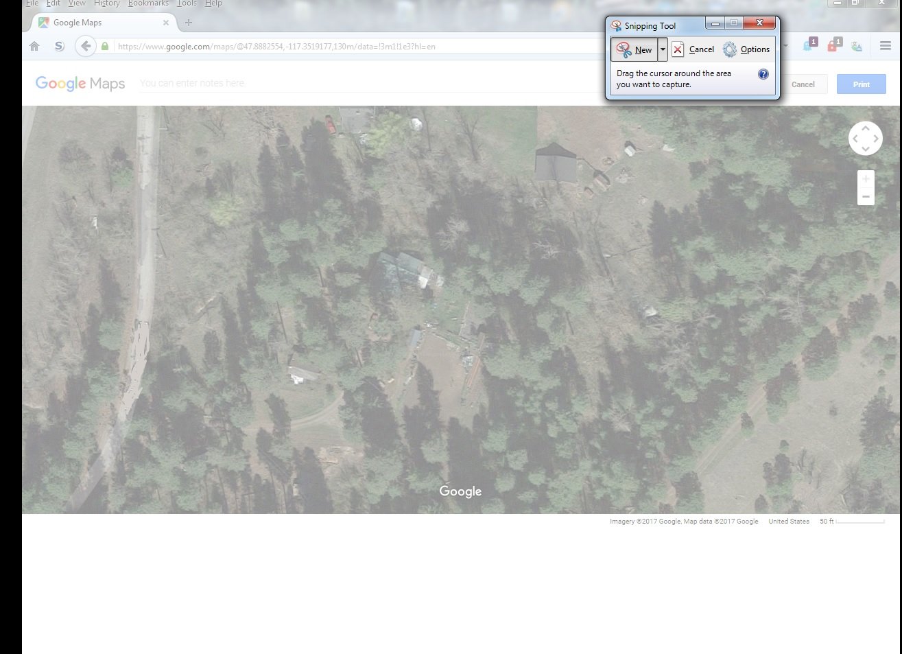 Once you have your sizing correct at the right zoom level, you will go to the menu on the search box in the upper left corner and go to print. ((Note- you can turn off labels under Satellite in the options menu to remove road labels))