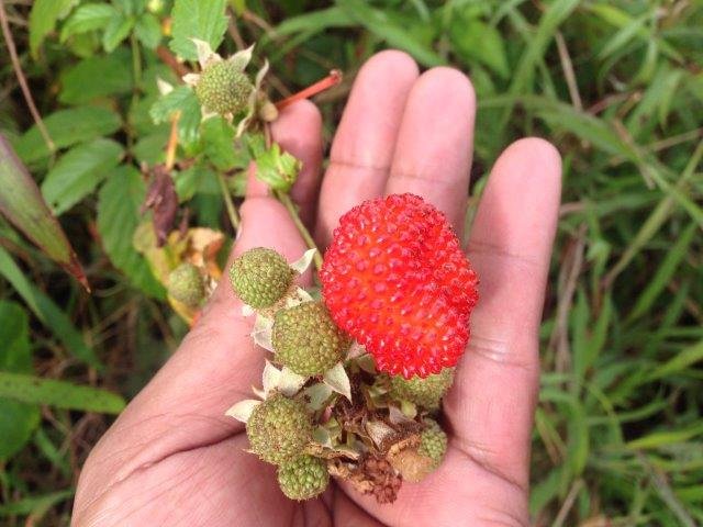 Here is a closer look at this amazing berry, the plant is thorny and the fruit has a sweet and mild acidity taste! The more ripened ones are the sweetest! I know it by the name of wild strawberry!