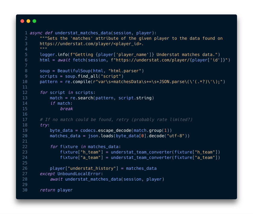 The information in the playersData variable was however not enough. It contains each player's xG, xA etc. for the entire season, but doesn't distinguish between opponents. Thankfully each player also has their own page (https://understat.com/player/<player_id>), and so I used the lessons learned when I made fpl asynchronous to retrieve all this information.