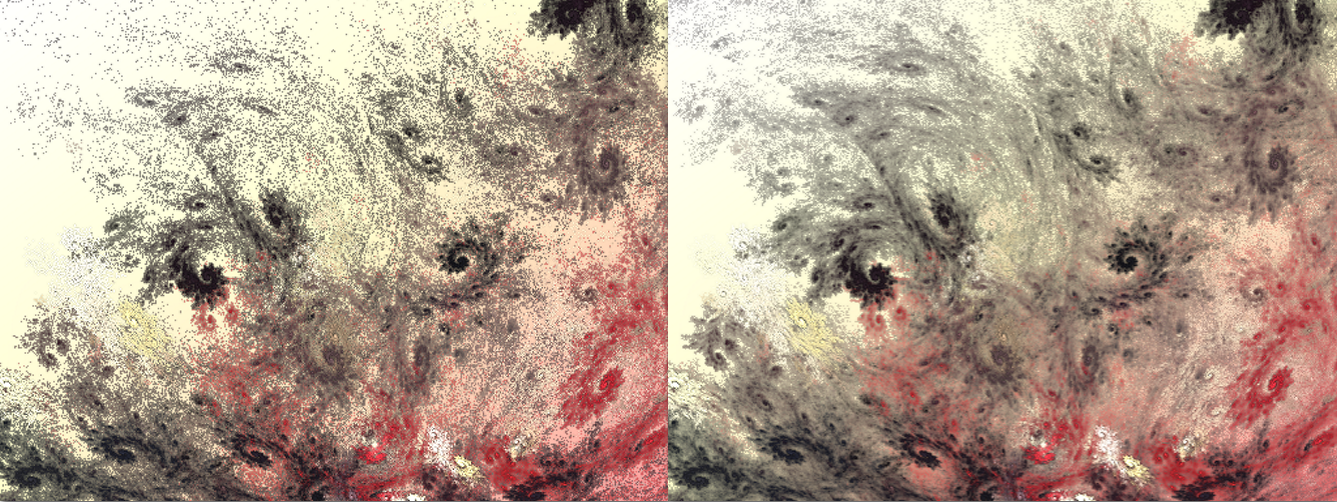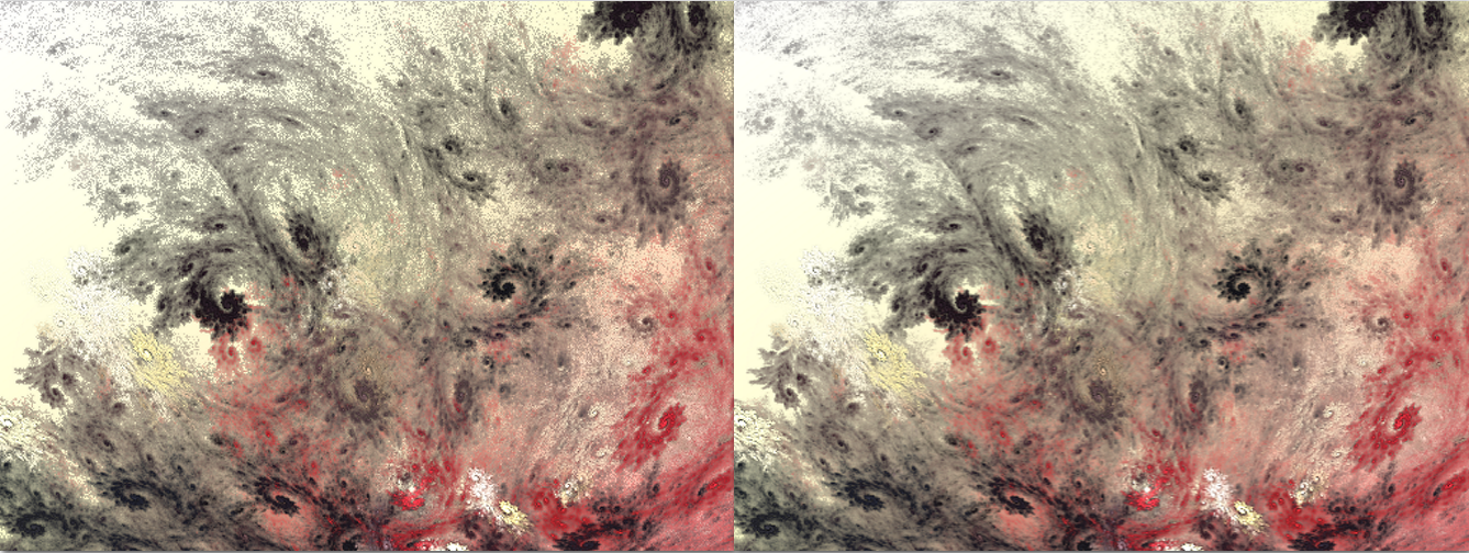 The left image is rendered with Quality=10 (rendering time: 1.3sec) and the right image with Quality=100 (8.2sec). It is obvious how the pixels are diffused in the first case, while in the second, they are more smooth and continuous.
