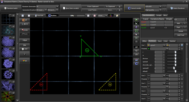 Now, let’s try something more … swirly! First, a combination of 2x “linear3d” and 1x “cpow3” variations gives the simple grid of the screenshot below:
