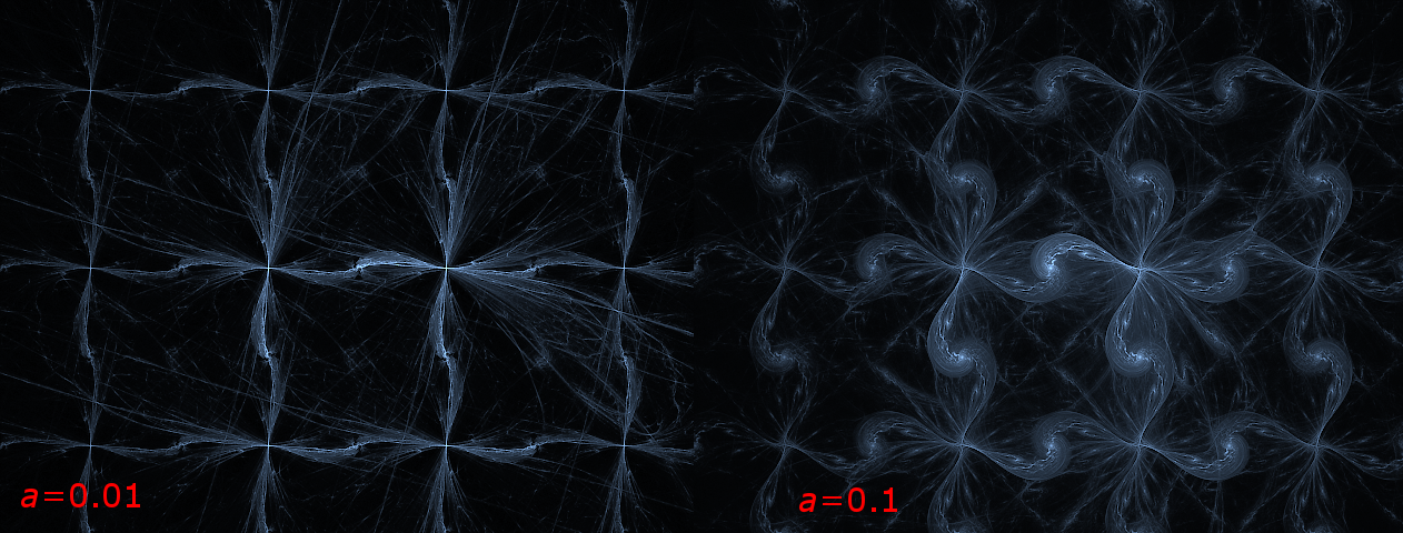 The “cpow3” variation uses several variables, but we will change just one: variable a is increased by 0.01 in the 1st picture and by 0.1 in the second. When these minute changes go through hundreds & hundreds of iterations of the other variations and each time are fed back to “cpow3”, ultimately, they scale up and produce something completely different: