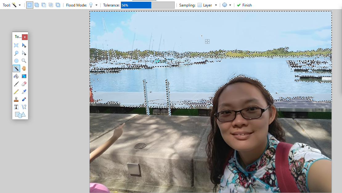 Click on the area you would like to highlight and delete later in the photo. Check the "tolerance" % at the top middle of the dashboard. Play with the figure, and you will see the difference in the highlighted area. The first image I selected 56%. The second image I selected 17%.