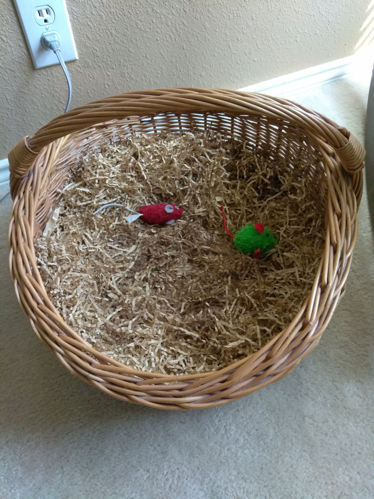 And the last basket, holds all their toys, cat nip mice, feather tethers, and my golf ball.