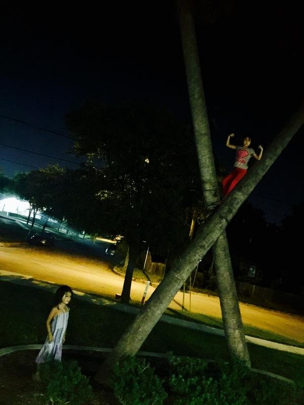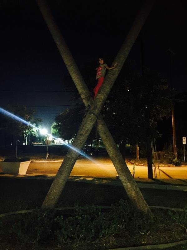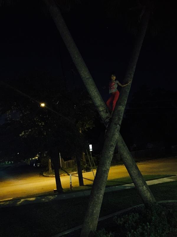 As you can see here she climbed into these two plam trees making an X. Palm trees are sometimes tricky to climb because they have no branches. This one was at just enough angle to climb and then when she got to the X she had a nice perch.