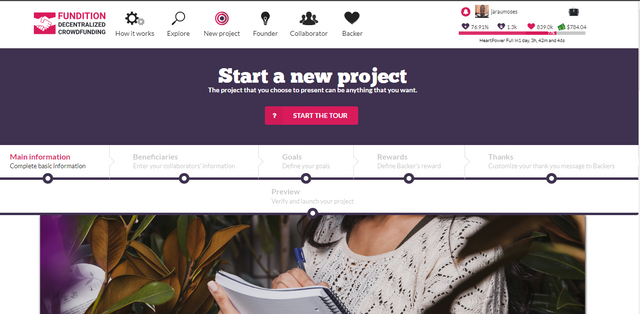 It is advisable to take a tour of Fundition.io before starting your project, just click on Start the tour . The tour answers most of the basic questions that you might have like beneficiaries of project, goals and all information required for your project.