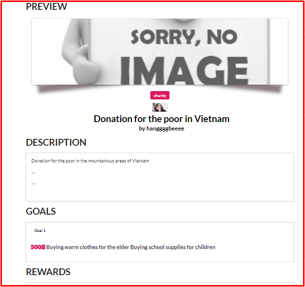 In this step, you can see whole your post with every step you have just done. Don't forget that a good presentation of your project can attract more engagement from Backers. Check it carefully and make sure that everything clean and clear.