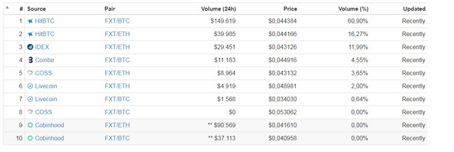 Coinbe topped the floor trading volume of FXT most with the BTC.