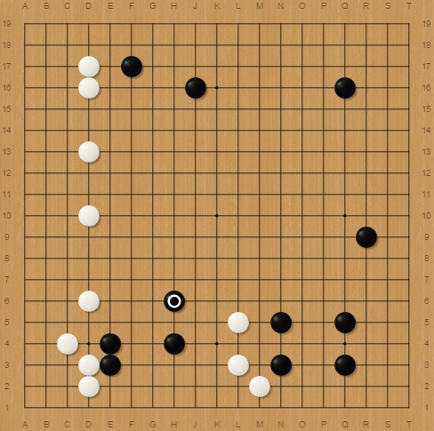 I was feeling great with my extension move but at this point, if I had continued descending with him and play E2, I would felt like my move H4 was really too close to my wall. At that point, I thought ok I’m going to play there but I rather play a big move. I chose to approach his upper corner.