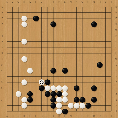 Here is the result of our little fight, I only have one eye and I’m threatening to make another one but it’s easy for his to prevent it. The eye G4 isn’t an eye, it’s a false one. Obviously, he wanted to save his group so he played the killing move F6 but there is a tesuji (smart move) there waiting for me !