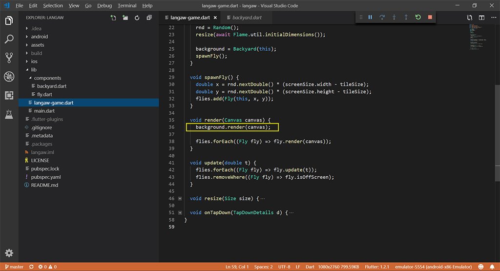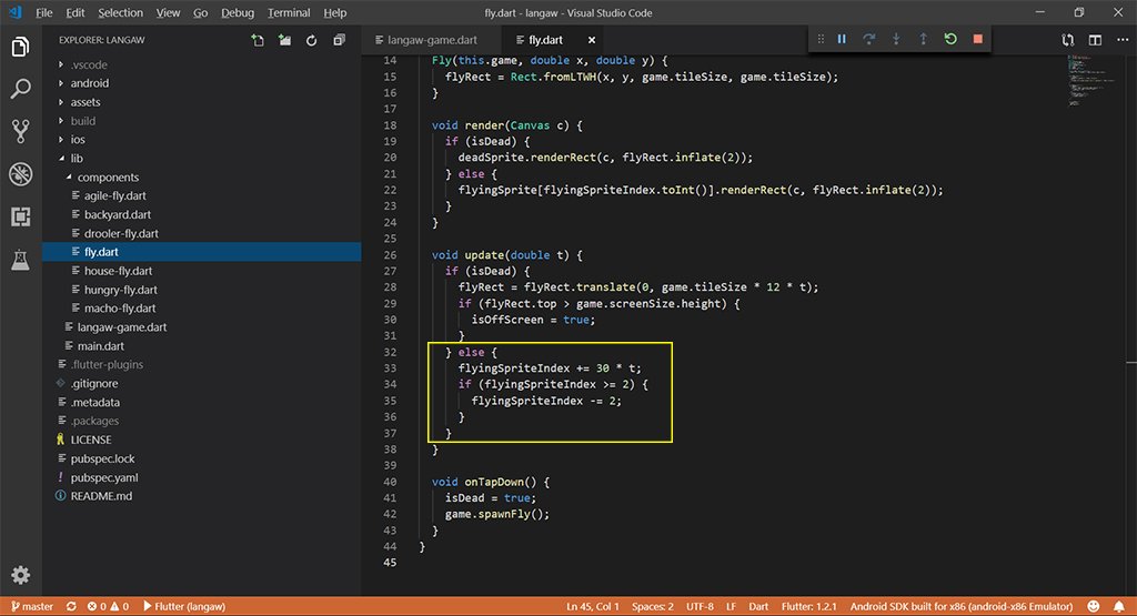 Our biggest fly is now 2.025x that of game.tileSize. So let’s quickly jump to ./lib/langaw-game.dart and modify the max value of both x and y in the spawnFly method: