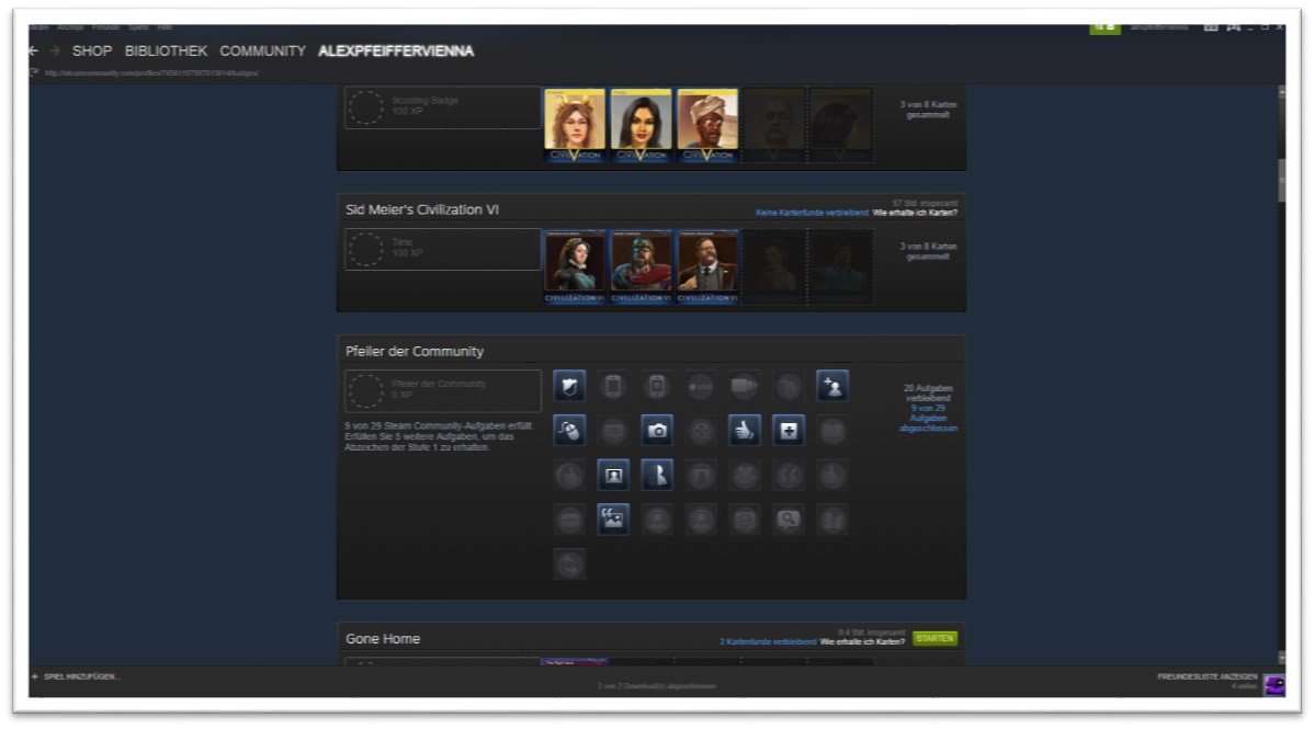 The last part for this article is the gamification around games done by the platform you bought the game online. E.g. steam. You get achievements, badges and trade able objects by playing the game and again (like in to MMORPG) example doing some funny stuff or discovering something special. This shows the progress of the game in a very exciting way and many players have a look on the list of achievements and try to find out what to do to get the others. As often you simply know the name of the next one but not the quest to go for it.