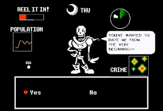 First up, there's Papyrus. None of the dialogue choices with Papyrus matter at any point. All that matters is that, after Sparing him in battle, the player visits him at his home and agrees to have a "date." This date consists of more dialogue and choices without consequence, though it is a very charming scene. It is a shame, though, because the 'date' switches to a perspective and style similar to the game's battles; it would've been great to forge a more specific relationship with Papyrus through it.