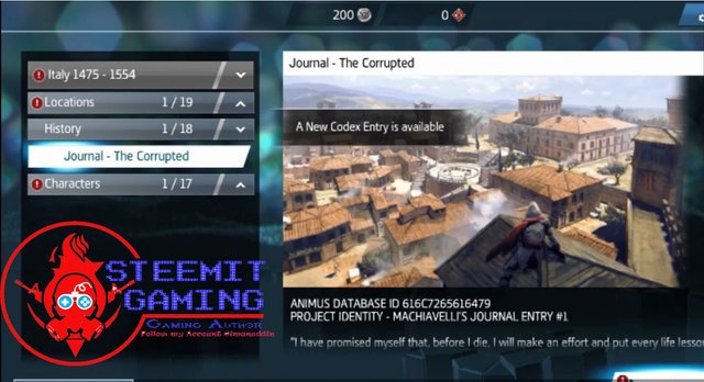 After successfully finish the first mission we go back to the animus which animus that is the main menu on this game. Next we are directed to the codex. Which function from the menu of codex is to see history from enemy characters, locations, and the Mission of the journal of the missions that we want to accomplish and we already completed.