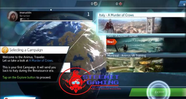 Setelah itu akan muncul menu utama pada game ini dan kita harus mengikuti tutorialnya lagi untuk menyelsaikan misi-misinya.dimisi pertama kita berada di itali yang berjudul “A Murder of Crows” yang mana didalam ini terdapat banyak misi-misi yang harus kita selesaikan untuk mengikutinya maka kita harus masuk ke menu explorer untuk memulai misi yang ada di kota itali ini. Setelah kita masuk ke menu explorer maka akan muncul misi pertama yaitu “The Corrupted” yang mana di misi ini kita harus mencari dan membunuh seorang Mercenaries dan membunuh lima pasukan penjajah militia. Kalau kita bisa berhasil menyelesaikannya kita akan mendapatkan 200 koin perak dan mendapatkan baju. sambil memainkan misi ini kita bisa memakai virtual reality supaya seperti kita yang bermain. Nah jika kita telah membunuh satu pasukan penjajah militia jika ketahuan maka kita harus bersembunyi kita tempat yang telah disediakan yang berlambangnya wajah, kita harus sembunyi sampai tidak terdeteksi lagi oleh pasukan penjajah militia. Kalau kita ketahuan kita harus melawannya dan dimisi ini kita harus mencari 2 orang mercenaries yang lagi sibuk berbicara dengan pasukan militia dan kita harus membunuhnya dengan hati-hati agar tidak ketahuan oleh pasukan militia.jikalau sudah berhasil membunuh 2 orang mercenaries kita diwajibkan lari sejauh 35 meter ke arah tempat titik yang telah diatur untuk meyelesaikan misi pertama. Setelah itu misi pertama selesai.