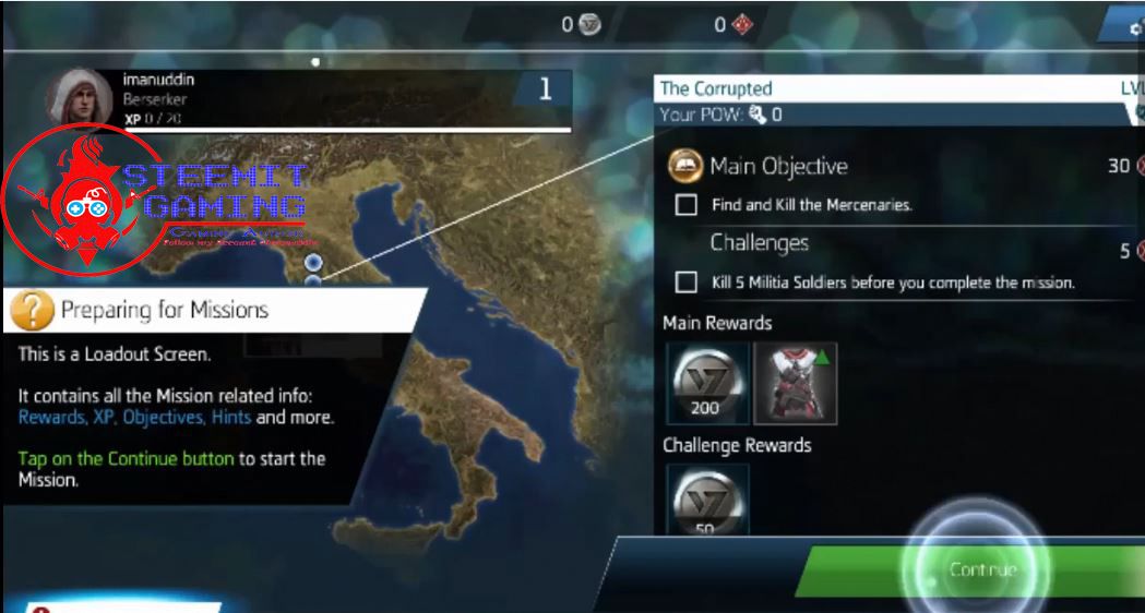 After that the main menu will appear on this game and we have to follow the tutorial again to finish the mission-first dimisi mission. we are in Italy titled "A Murder of Crows" which in many missions we have to resolve to follow it then we have to go into the menu of the explorer to launch the Mission in Italy. Once we enter the menu explorer then will appear the first mission which is "The Corrupted" which in this mission we have to find and kill a Mercenaries and killed five militia troops invaders. If we can successfully solve them we will get 200 silver coins and get a shirt. While playing this mission we can wear a virtual reality so that as we play. Well if we have killed one troops invaders militia if caught then we should hide our place has been provided which berlambangnya face, we have to hide to undetectable again by colonist militia. When we found out we have to fight it and we have to find this dimisi 2 people of mercenaries which again busy talking with the militia forces and we must kill it carefully so as not to be known by the militia if already killed. 2 people are required to run our mercenaries as far as 35 meters to the place of the point that has been set to finish the first mission. After that the first mission is completed.