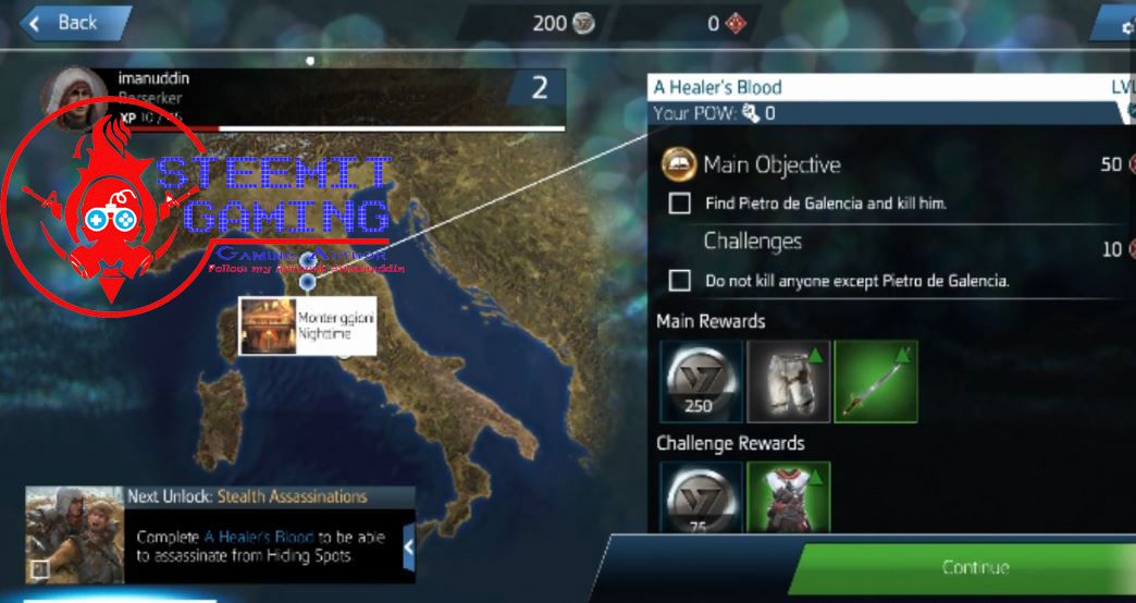 Next we run the second mission remains the same is the city of Italy, which this second mission named "A Healer's Blood" was in an area called Monteriggioni which in this mission we need to find someone named pietro de galencia and we must kill it and we shouldn't kill anyone other than pietro de galencia because when we kill people who are not on the search mission was considered imperfect. If successfully completed with perfect then we would get 200 silver coin, different strength, armor and sword and if detected by the invaders we must fight it in order not to die and if you don't want it, then we had to hide in a place that has been specified in this mission because we are in the area of enemy troops. To distinguish the area of enemy troops and not then you guys can look at a map which is beside the left bottom that label if they are red then we are in the area of enemy troops and if the green or no color then it is open area enemy troops after killing him then we must escape from the place of murder as far as 90 metres to finish the second mission of this. after that second mission is completed.