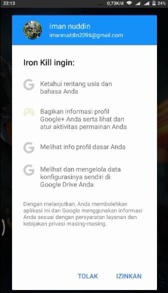 Setelah kalian berhasil mendownload aplikasi game ini maka selanjutnya kalian harus membuka aplikasi dari game yang telah kalian download yang mana selanjutnya akan muncul menu yang berwarna hijau yang mana menu tersebut bernama Google Playgame yang mana menu tersebut berfungsi untuk mendaftarkan akun game ini secara otomatis tapi handphone android kalian harus terhubung di Google Playgame yang mana Google Playgame ini dihubungkan melalui email kalian. Jadi supaya bisa mendaftarkan akun game ini ke dalam Google Playgame jadi kalian harus menghubungkan email kalian ke dalam Google Playgame yang ada di handphone android kalian jadi kalau kalian sudah menghubungkan nya maka selanjutnya kalian bisa mendaftarkan akun game ini secara otomatis dan kalau kita mendaftarkan akun game ini menggunakan akun Google Playgame yang terhubung melalui email kita maka akun game yang kita daftarkan secara otomatis ini akan bertahan lama walaupun kalian mengganti handphone baru maka begitu kalian ingin memainkan game ini lagi maka kalian bisa menghubungkan ke akun Google Playgame kalian yang lama selanjutnya secara otomatis kalian bisa memakai akun game kalian yang lama sehingga kalian tidak perlu mengulangi kembali misi yang ada pada game ini. kalian bisa melihat saya yang mana disini saya memakai akun google Playgame yang mana terhubunga melalui email saya jadi kalian harus mengikuti cara saya supaya akun game kalian bisa bertahan lama dan takkan hilang kecuali kalian lupa dengan password email kalian. Selanjutnya kita harus menekan tombol izin agar bisa mendaftarkan akun game ini ke aplikasi Google Playgame.