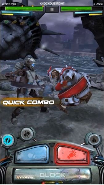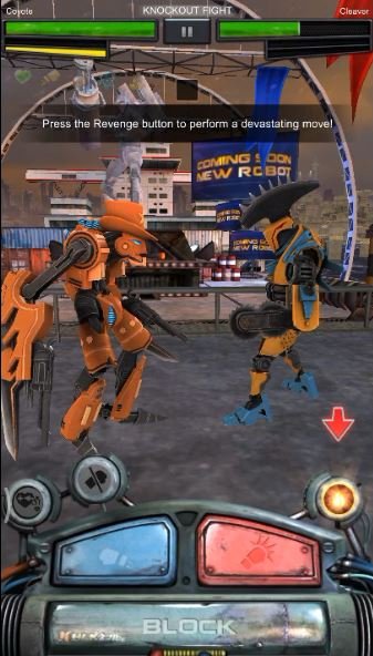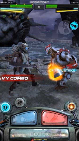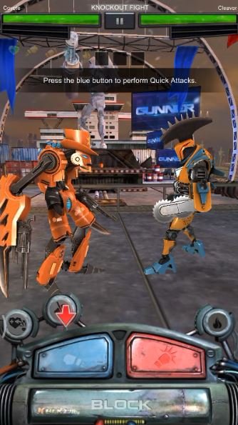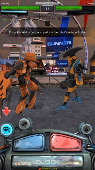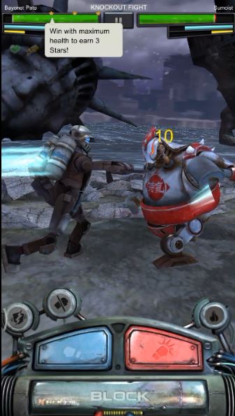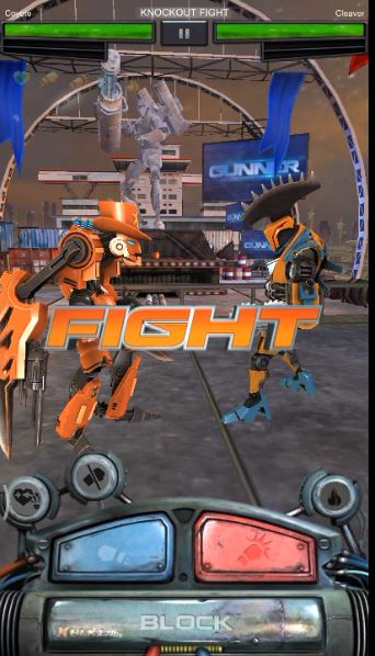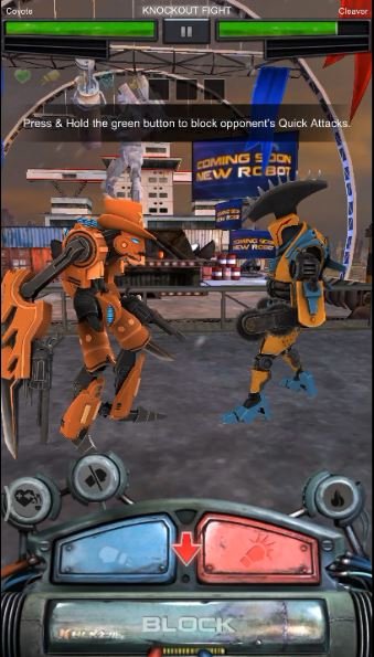 Selanjutnya setelah mengetahui cara memukul robot musuh dengan pukulan Quick Attacks dan Heavy Attacks maka selanjutnya kita akan di ajarkan bagaimana cara menahan pukulan dari robot musuh yang mana selanjutnya kita bisa melihat yang mana kita harus menekan tombol yang ada pada layar handphone kita yang mana tombol tersebut bernama BLOCK. Sehingga kalau kita ingin menahan pukulan dari robot musuh maka kita harus menekan tombol tersebut agar jika ada ada robot yang ingin memukul kita darah yang kita miliki tidak habis. Selanjutnya di pertarungan latihan ini kita harus juga menekan tombol ini sebanyak 3 kali untuk menyelesaikan latihan menahan pukulan musuh yang mana jika berhasil menyelesaikan nya kita akan masuk pada latihan selanjutnya.