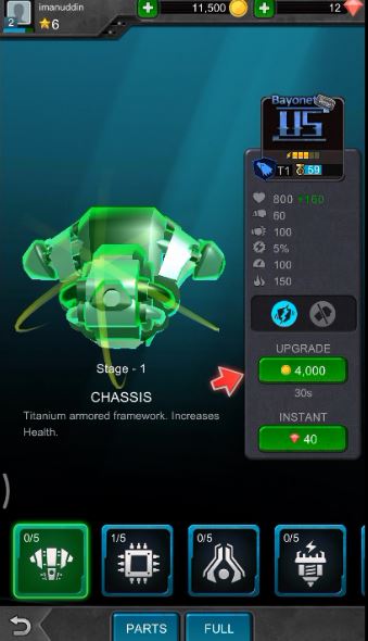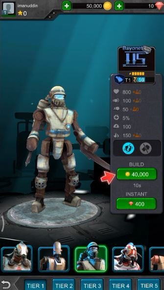 Next to start playing TIER 1 then we are required to buy one Robot in this game that serves to play the robot in this TIER 1 mission. which then we can see a lot of robots that exist in this menu. here next I choose a robot named BAYONET which then to be able to buy this robot then next we have to buy it by way of removing 40,000 gold coins in this game funds after I managed to buy this robot then my level increased to level 2 that is on this game and also i get a red diamond which amounts to 2 diamonds. Next after successfully buying a robot named BAYONET then next we have to wait a few seconds to be able to complete the process of purchasing robots and if you can not wait then you can press the red diamon button which its usefulness can finish the existing time so for you who do not be patient then you can press the button and remove the red diamond is in this game.