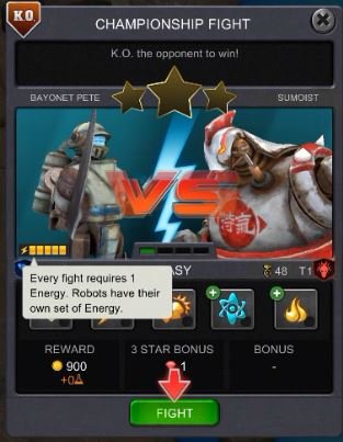 Selanjutnya kita akan bermain di ronde 1 yang mana pertandingan yang ada pada ronde 1 ini adalah pertandingan K.O yang mana berarti pertandingan yang ada di dalam Ronde 1 hanya sekali pertarungan saja jadi jika robot musuh yang ada pada Ronde 1 ini berhasil kita menangkan maka kita akan bisa melanjutkan ke RONDE 2. Selanjutnya setelah kita menekan tombol ronde 1 ini kita akan melawan Robot musuh yang bernama SUMOIST yang mana bisa kita lihat robot musuh ini memiliki kekuatan sebanyak 48. Jika kita berhasil memenangkan ronde ini kita akan mendapatkan hadiah 900 koin emas yang ada pada game ini. selanjutnya jika kita ingin memulai memainkan misi ini maka kita harus mengeluarkan 1 energi yang ada yang mana energi tersebut bisa kita lihat dengan di beri tanda garis yang berwarna kuning. Selanjutnya kita harus menekan tombol yang bernama FIGHT untuk memulai memainkan pertarungan pada ronde 1 dengan melawan robot yang bernama SUMOIST.