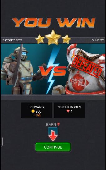 setelah itu kita bisa mendapatkan hadiah uang sebanyak 900 koin emas yang ada pada game ini tapi di ronde 1 ini saya mendapatkan 3 bintang serta juga kita bisa mendapatkan 1 diamon yang berwarna merah serta kita bisa melihat rulisan Defeat yang mana robot musuh yang bernama SUMOIST ini bisa kita kalahkan. Selanjutnya untuk masuk ke menu misi lagi maka kita harus menekan tombol CONTINUE.