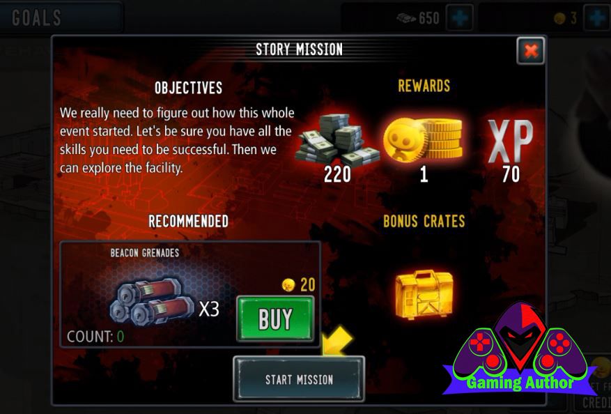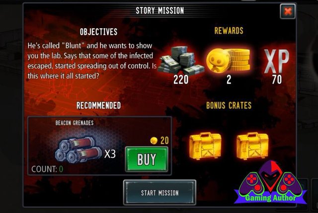 Next we meet with the zombies are aplenty and among the zombies can be a zombie-like monsters that are red are where the zombies that zombies are very great that in this mission we will teach how to use the grenades could destroy a lot of the zombie Horde that is to use the grenade then we need to press the button on the tick with a picture such as a grenade which we have to press the button so that it killed the Assembly of the zombies that appear. After successfully killing a bevy of zombie it then we should kill the zombies that leads toward us again and we must kill all the zombies. Next we find the yellow sign indicating where to complete this mission so we must fast approaching the yellow sign so we can finish this game and if we do not quickly approaching the yellow sign then the zombies will continue to trickle in. So I suggest if you guys play this game if you already found the yellow sign then you guys should be fast approaching these alerts so that you guys can survive and can complete missions in this game. After successfully completing this first game we will get prize money and EXP can add a level of character in this game. and we are back to the main menu to play the next mission.
