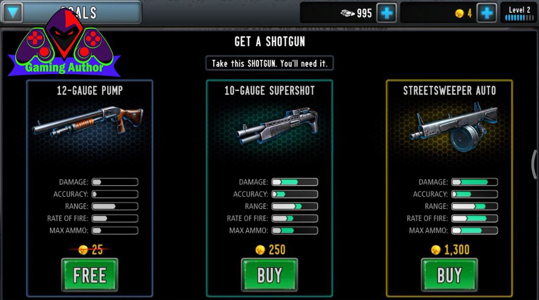 Which of these three guns that where we have to purchase it with gold in this game and get lucky once there is one weapon SHOTGUN named the 12-GAUGE PUMP get a discount so we don't have to pay him with gold so we get her for free so I suggest you guys buy this gun just because if we buy weapons other then having to need gold in this game. Despite the power of this weapon is not as strong as other SHOTGUN but both weapons can we kill the enemy so that we can get a weapon more than ever.
