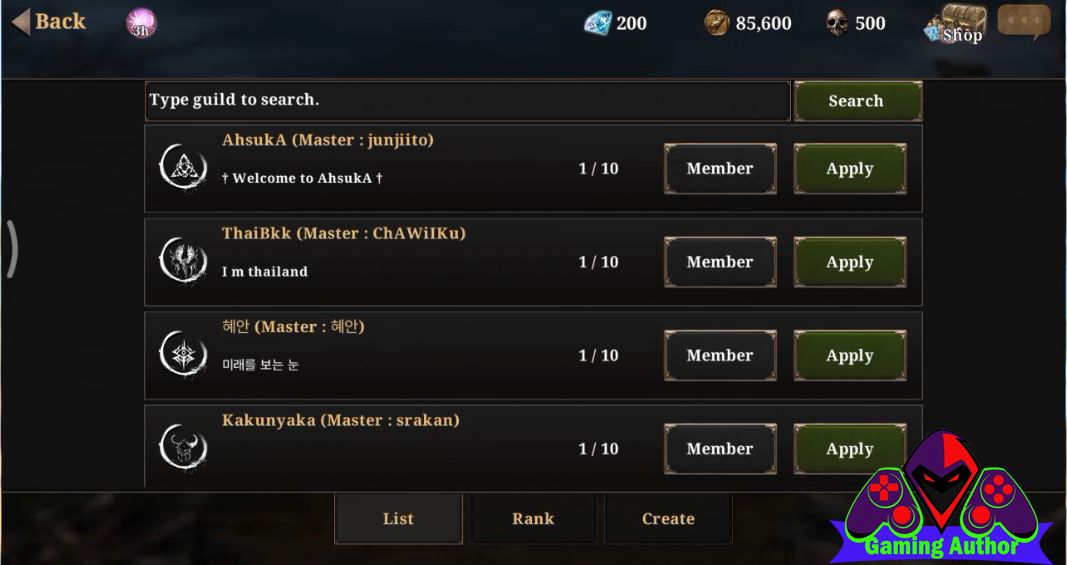 Next we enter on the menu named GUILD which this menu function to recruit new members of the team and could make a new team and we also get to see a team that already has the highest rating of this game. The following is a menu that is in this GUILD: