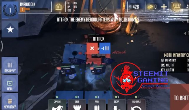 Next we move our troops to attack enemy headquarters using the button named "MOVE | Army "which is useful for attacking enemy troops located at the headquarters. selnajutnya we can press a button named "TO BATTLE" to start a war between the troops and the boss of the enemy forces.