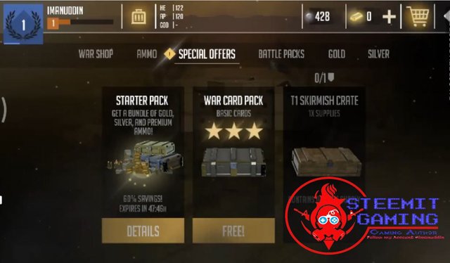 After that we went back to the start menu and look for the menu shop which is in the menu shop we should open the menu again named "SPECIAL OFFERS" in the menu we had to buy a CARD PACK called "WAR" which is where this menu we can buy for free that's a gift that we know of. After we buy it for free and opening the box we will be rewarded in the form of :