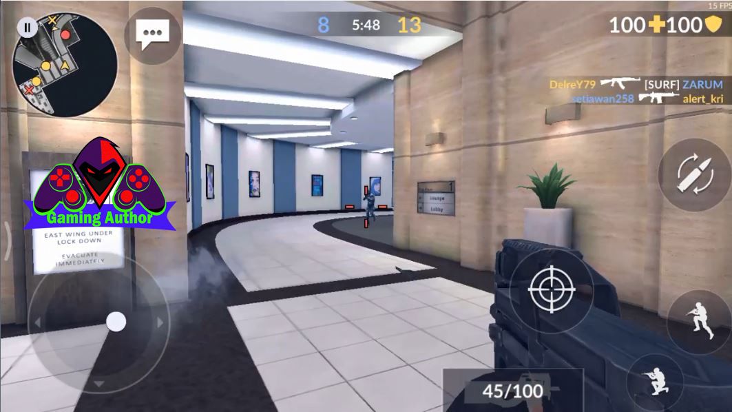 Next before playing this game then we will select the TEAM which was here there is a second that is COUNTER-TERRORISTS and TERRORISTS so we must pick one TEAM from both the TEAM where if the TEAM COUNTER-TERRORISTS means as policeman While the TERRORISTS as members of the evil and if you guys are confused to choose a TEAM which then you can press the button called AUTO ASSIGN and if you guys don't want to play this game but to look around just so you guys can push button named SPECTATE. Here's my next pressing TEAM COUNTER-TERRORISTS which as a police officer. Next we can enter into this game which we must be good at moving our character by pressing the button in use as analog images that are on the screen of our mobile phones so we must press the analog image in order to move and run our character to the right, to the left, forward and backward. Next to see the enemy and drive a shot toward the enemy then we must do by pressing the button located on the right hand by way of shifting to the right and left to see enemies that are before us so that if the right direction then the enemy target is red so we had to do a shot by pressing the button that is on the screen of our mobile in marked with images like a spherical target that is on the right side down on the our mobile screens and continued firing until the enemy dies. in this game the enemies it is other people who play this game because we are playing against the people who join in this game so the enemies that we are opposed to is not the computer that plays him but the people in the world who plays him. And in a game called GUN GAME mission we should be killing up to 15 people so we must kill as many as 15 people so if we can't kill 15 people then if other people managed to kill 15 people then he win this game so we must be the most killing people. Its tasteful and play in a game called GUN This GAME did not use time so we have to try to kill all the enemies quickly in order to be a winner.
