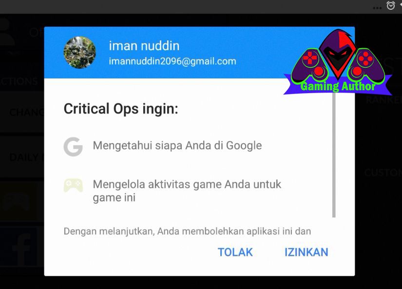 Next after successfully obtaining weapons then the next we are directed to create an account which is useful for this game. which here we can create an account this game using google palygame and facebook so you can choose one account to create accounts automatically in this game. but here I make an account of this game by way of wearing your google account playgame you guys so if you guys want to register a game account with google you guys then you guys can playgame pressing green button so if you guys next pressing green button it will pop up the email verification from us that we connect to your google account playgame is there in our mobile phone then it if you guys want to register an account this game wearing a google account playgame then you guys should hook up email you guys to google accounts playgame you guys like me. Email verification after appearing like me then you can press the button to ALLOW to allow that we make this game using the email account google playgame. So I recommend to you guys who want to play this game must register and create an account this game by using your google account and facebook account so playgame if you guys wear it both ways then you will account for him so that if you guys play this game using mobile phone other then you guys can link to your game so that you do not the old crappy reiterates this game so you guys can play in further on this game. After successfully registering an account of this game then we can replace the name of the character of this game and here I replaced with my own name so if you guys want to replace with you guys it's a right you guys because we are free to make the name of who only.
