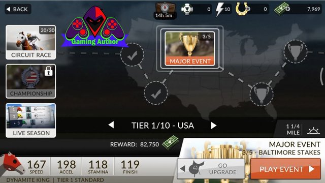 After that we went back started racing MAJOR EVENTS 3 which if our horses not enough pace then we must upgrade first in order to be able to play it. And if we managed to upgrade our horses then we can play a MAJOR EVENT the third. Which if we successfully completed the race then we will get a bonus prize money as much as 82,750. And on this third race we need 1 of energy we should use to play this game in which the energy in a lightning symbol marked with colored silver which is contained in the screen of mobile phone you guys on this game. Next Next you must press the button named PLAY EVENT to start the race on the third MAJOR EVENT menu. And on the third MAJOR race of the EVENT we are going to play the event races named BALTIMORE STAKES.