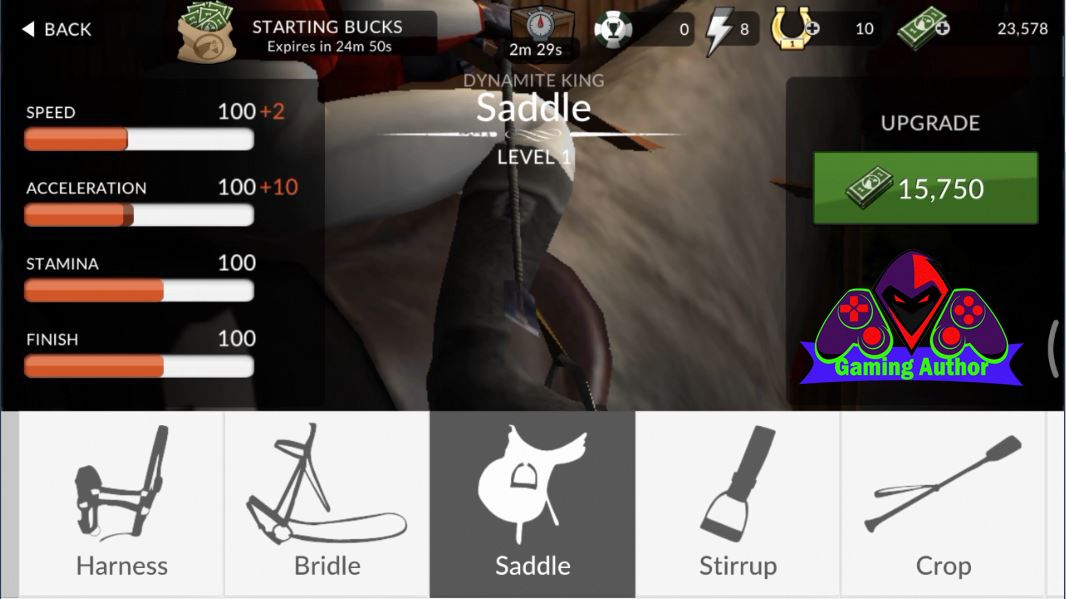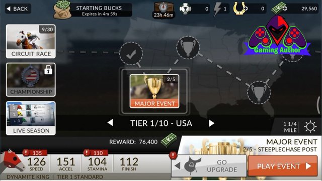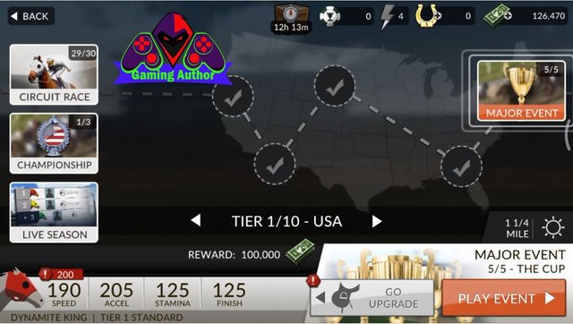 Furthermore if you guys want to play the race at the first MAJOR EVENT of the menu it then you have to add the speed and strength of the horses you where can you guys add the UPGRADE menu in which we can add the menu speed horses and the power of the horse to win the race so that there is a MAJOR EVENT on the menu. Which in this UPGRADE menu there are a number of features that are useful to add power and speed horses this is the name of the menu that can add speed and strength of our horses: