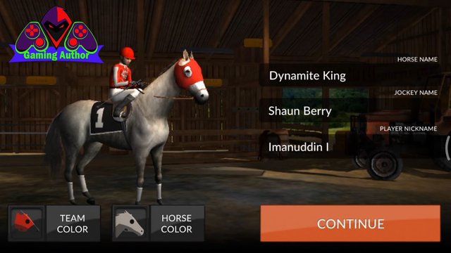 After successfully filling the age you guys then we will go on the menu early this game which we require to change color in horses we are where we have to change the color of the horse on the menu named HORSE COLOR. Next we replaced color shirt from our team which also change color to our team so we can replace through the menu TEAM COLOR. Next we can substitute the name of the horse you guys who. The name jockey you guys whom as well as the name of a character from this game palyer who. All depends from you guys that play this game want to make anyone's name. But here I just make my own name on the player's nickname to indicate that I am playing this game. After all it is finished then you guys can CONTINUE pressing the button to start the race.