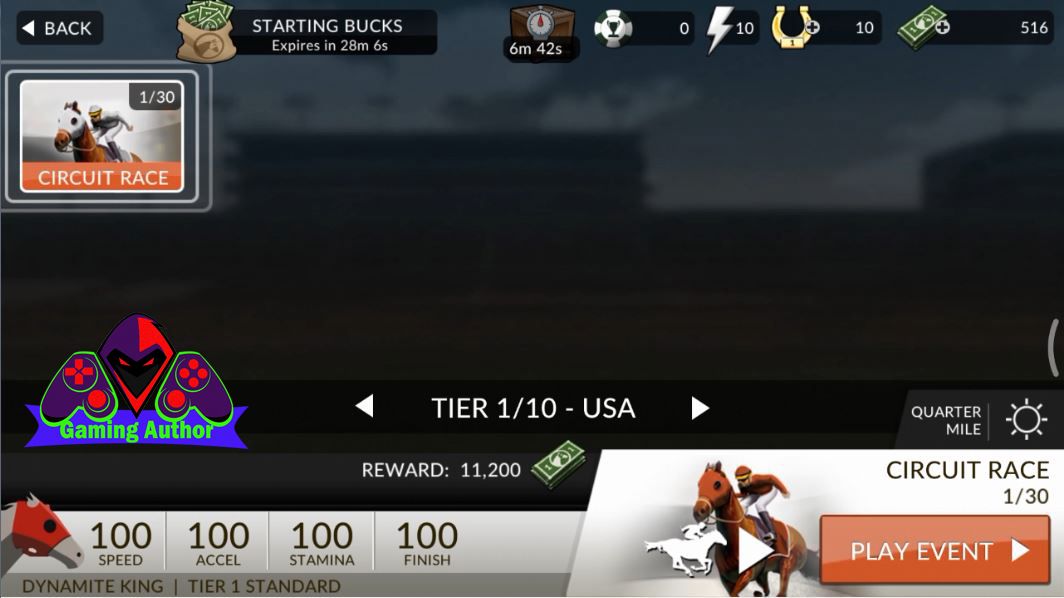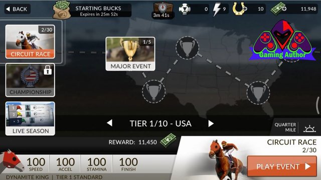Next we come back again to play the second race at the RACE CIRCUIT where the menu at this race we can earn some money to be able to add speed and force us to our horse so that if the speed we're getting really good then we can start the races are on the menu of MAJOR EVENT because this menu is not a horse that can play it. Therefore we should add speed and power to get our horse racing can play in MAJOR EVENT menu. For that we have to do the race again in this RACE CIRCUIT if the menu can be up to 30 times the race hehehe.Next on the menu are in the race CIRCUIT RACE this we need 1 of energy we should use to play this game in which the energy in a lightning symbol marked with colored silver which is in Mobile you guys on screen This game. Next you must press the button named PLAY EVENT to start the second race that is on the menu this RACE CIRCUIT.