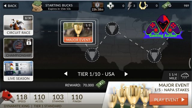 Next we play in MAJOR racing events menu where menu is the menu that we have to finish the race in CHAPTER 1 of this which we'll have to do the race as much as 5 times to open CHAPTER 2 who at the beginning of the play this game only 1 open the race we must win to open a second until the fifth race so that it can complete the mission MAJOR EVENT and opens the CHAPTER 2. Which here I play the race 1 of this MAJOR EVENT and if we successfully completed the race then we will get a bonus prize money as much as 70,000. And in this first race we need 1 of energy we should use to play this game in which the energy in a lightning symbol marked with colored silver which is contained in the screen of mobile phone you guys on this game. Next Next you must press the button named PLAY EVENT to start the race at the first MAJOR EVENT of the menu. And in the first MAJOR race of the EVENT we are going to play the event races named NAPA STAKES.