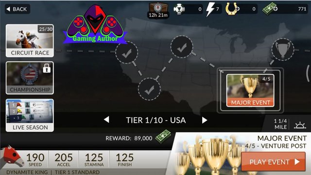 After that we went back started a MAJOR race EVENT 4 which if our horses not enough pace then we must upgrade first in order to be able to play it. And if we managed to upgrade our horses then we can play a MAJOR EVENT of the fourth. Which if we successfully completed the race then we will get a bonus prize money as many as 89,000. And on the fourth race this we need 1 of energy we should use to play this game in which the energy in a lightning symbol marked with colored silver which is contained in the screen of mobile phone you guys on this game. Next Next you must press the button named PLAY EVENT to start the race in the fourth MAJOR EVENT menu. And on the fourth MAJOR race EVENT we are going to play the event races named VENTURE POST.