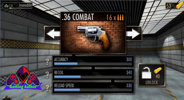 When you are finished playing the BONUS menu we get next we return to the main menu and look for the menu called GUNS of which this menu we can buy new weapons we can use to practice shooting and doing matches shoot against the original play in this game. which after pressing the button here I bought a weapon named 36 COMBAT where we can buy this weapon with 40 gold money on this game so here we have a lot of money which we get after successfully finish the game and practiceshooting in this game. so if our money is enough to buy a gun then we can press the UNLOCK to unlock and buy and wear, and we can also add the power of our weapons which features menus for adding our weapons so we can see in the bottom of the image this weapon which his features are: