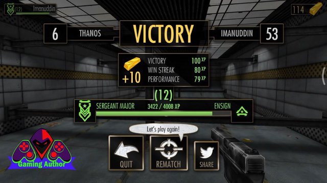 Next we can see the end result of target shooting match results of the CERAMIC where we get a value of 53 while our opponents named THANOS only get value of 6 so we managed to win the game shooting This CERAMIC. so when the next CHAT menu appears like LES'T PLAY AGAIN in the REMATCH will mean our opponents want to repeat counter again with the CERAMIC and shoot at targets if you guys agree to him then you can press a key REMATCH and If you do not agree to him then you can press the QUIT to return to the main menu of the game.
