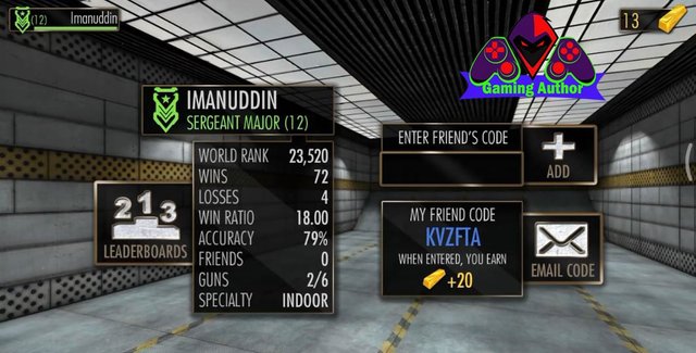 Next after learning about the menu GUNS then next we return to the main menu the main menu in which there is a named PROFILE menu to open the menu and then we need to press the menu button. After the menu was open then we can see our PROFILE which we can see the rankings position us as an SERGEANT MAJOR and we could see the rank and can see the results of won and lost matches in the shoot and can also Add friends by using the provided code.