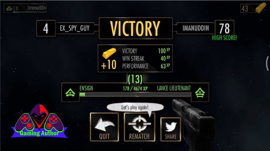 Next we can see the end result of target shooting match results of the UFO aircraft where we get a value of 78 while our opponents named EX_SPY_GUY only get value of 4 so we managed to win the game shooting aircraft UFO. so when the next CHAT menu appears like LES'T PLAY AGAIN in the REMATCH will mean our opponents want to repeat counter again with the UFO aircraft target shooting and if you guys agree to him then you can press a key REMATCH and If you do not agree to him then you can press the QUIT to return to the main menu of the game.