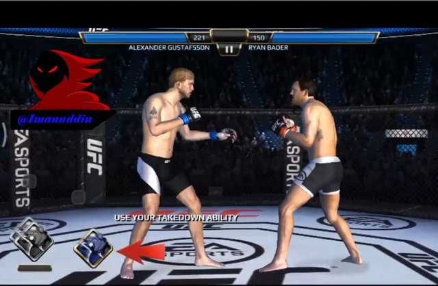 next after we defeated the Boxer named DAN HENDERSON and we'll do the fight again which as usual where we also wear fighter named ALEXANDER GUSTAFSSON which work as a BOXING fighter with 153 power level and against a boxer named RYAN BADER which profession as fighters WRESTLING with power level 128 next button will appear that says CONTINUE to start the fight, and by pressing a button named CONTINUE to start this fight. later in the third fight we will teach how to drop the opponent which will give a sign called purple that reads the ABILITY so we TAKEDOWN button purple we can directly drop your opponent and before we drop the opponent we are going to see the line in the game screen bar where we must be good at stopping the yellow needle right on the blue line so as to be able to get PERFECT and GOOD so get dropped Yellow needles, if opponents can't stop at the blue line then we will get writing MISS which we wouldn't be able to drop the opponent so that we have to repeat again to drop the opponent. After an opponent managed to fall will appear the words along with him that reads the LIGHT and MEDIUM in which the function of the LIGHT TAP of which point to hit the opponent by pressing the button on the mobile phone you guys once and the MEDIUM which is useful for hitting an opponent in a more robust which can be done by way of moving the fingers toward the bottom so it can hit your opponent is under us. next after we hit the opponents there will be a new power emerged again which power it will give the sign is green which is a function of the strength of this Green lock the opponent so that the opponent is helpless and cannot willing to fight us and we should be able to press the button that is already provided on the screens of this game so that should be pressed continuously so that the opponent's blood could be reduced quickly and we could win the fight quickly and get a KO because opponent helpless and managed to defeat us.