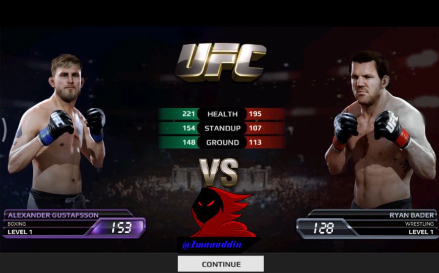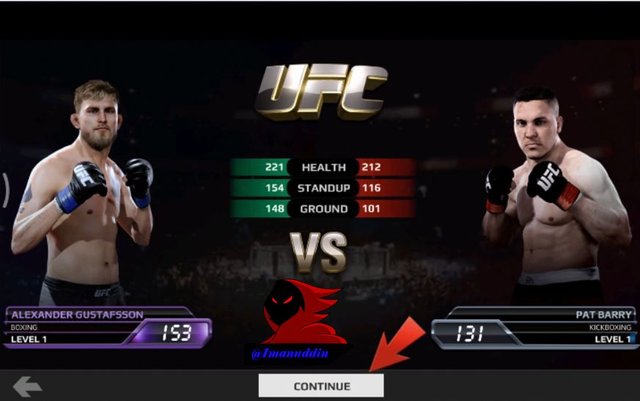 next after made it into the first fight we wear the same fighter ALEXANDER GUSTAFSSON which work as a BOXING fighter with power level and 153 against Boxer named PAT BARRY which profession as the Boxer KICKBOXING which have the power of 131 next button will appear that says CONTINUE to start the fight, and by pressing a button named CONTINUE to start this fight. After successful entry into the fight we must be good at seeing our blood that will be marked blue line above the screen of this game which do not let our blood is reduced so that we will lose or KO so we must be good at hitting your opponent with the way to teach such a LIGHT TAP, SWIPE, MEDIUM HEAVY DIAGONAL SWIPE. the first which I will explain the function of the LIGHT TAP of which point to hit the opponent by pressing the button on the mobile phone you guys all. the second function of the MEDIUM SWIPE which is useful for hitting with the use of the fingers by means of sliding the fingers to the right so that the opponent could hit properly. the third function of the HEAVY SWIPE DIAGONALLY which is also useful for hitting an opponent from the bottom over which shifts the way our fingers on the screen of mobile phone from the ground up to be able to use this punch properly. next in this fight there is strength and that we can use this power will emerge if we managed to hit the opponent continuously and this power will give a red sign on the screen of this game called ABILITY and which later will appear 3 power which we can use to beat your opponent which if the opponent is hit at our strength once it will be blood opponents will be reduced quickly so that if exposed to 3 power blow we could defeat opponents will be fast. and we must also be good at dodging blows the opponent in a way that named BLOCK and DODGE which first uses BLOCK to withstand the blows of the opponent by way of holding it with both hold that where so we can do this we should use BLOCK two of our fingers and pressing on the screen of our mobile phones so it can withstand the blows of the opponent with both hands and the second uses DODGE to withstand the blows of the opponent by way of backing into the back so that the opponent cannot wear his blows toward us and how to do it in a way we should use one finger and his moves towards the left so that the Boxer we will retreat to the back so we won't be exposed to the opponent's blow and we also can use the power of the blow we could use and this power will emerge if we managed to hit the opponent continuously and this power will give a red sign on the screen of this game called ABILITY and which later will appear 3 power which we can use to defeat your opponent which if the opponent is hit at our strength once it will be blood opponents will be reduced quickly so that if exposed to 3 power blow we could defeat opponents will quickly and if we don't hold it against the opponent we could drop the opponent by way of seeing power purple TAKEDOWN ABILITY so we pressed the button purple we can directly drop your opponent and before we drop the opponent we are going to see the line in the game screen bar where we must be good at stop the yellow needle right on the blue line so as to be able to get PERFECT and GOOD so can drop the opponent, if the yellow needle could not stop on the blue line then we will get a MISS writing where we will not be able to drop the opponent so that we have to repeat again to drop the opponent. After an opponent managed to fall will appear the words along with him that reads the LIGHT and MEDIUM in which the function of the LIGHT TAP of which point to hit the opponent by pressing the button on the mobile phone you guys once and the MEDIUM which is useful for hitting an opponent in a more robust which can be done by way of moving the fingers toward the bottom so it can hit the opponent under us and we can overcome them, and won the first fight. and it could get a star and can open the next fight.